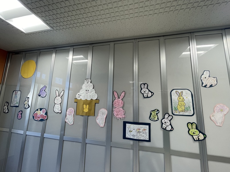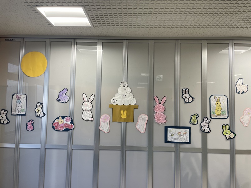 活動記録 デイケア~院内活動~ 投稿日:2025年9月22日(月)2025年9月22日(月) 9月のテーマは中秋の名月です。色々な表情のうさぎに思い想いに色を付けてもらいました。お月見団子の近くにいるうさぎはお花紙を細かく患者様が裂いてリアルなうさぎの毛並みに近づけ、ふわふわ立体的になっています!是非注目して一匹ずつ見てみてください!!