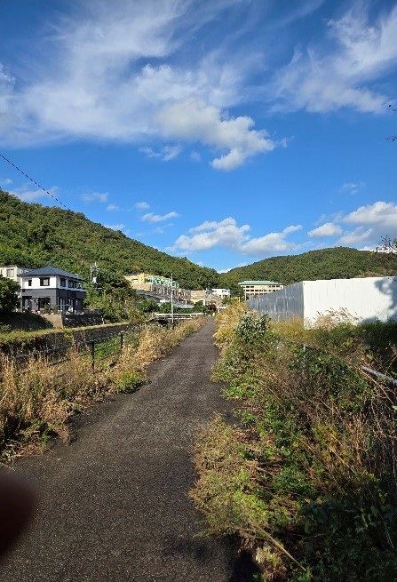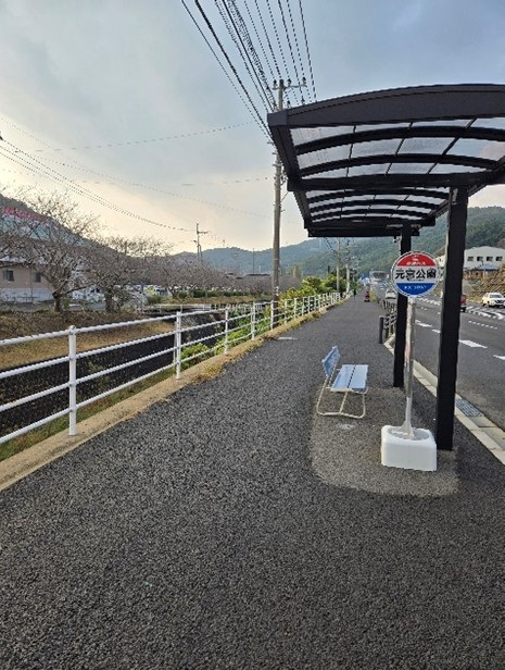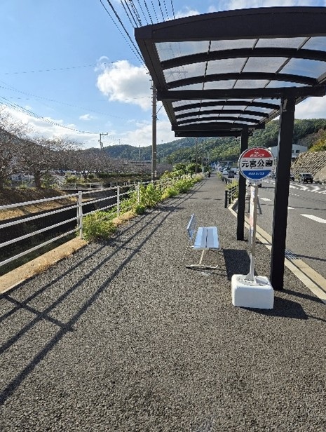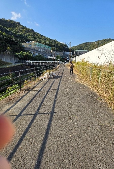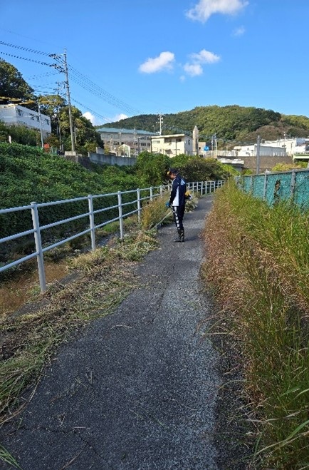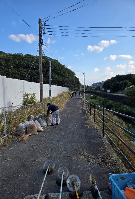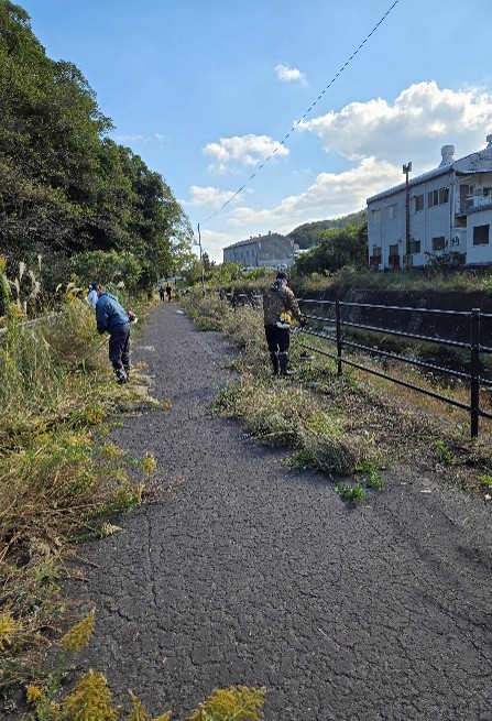 流れる大川沿いの道路、元宮公園前バス停近辺の草刈りとゴミ清掃を行いました。