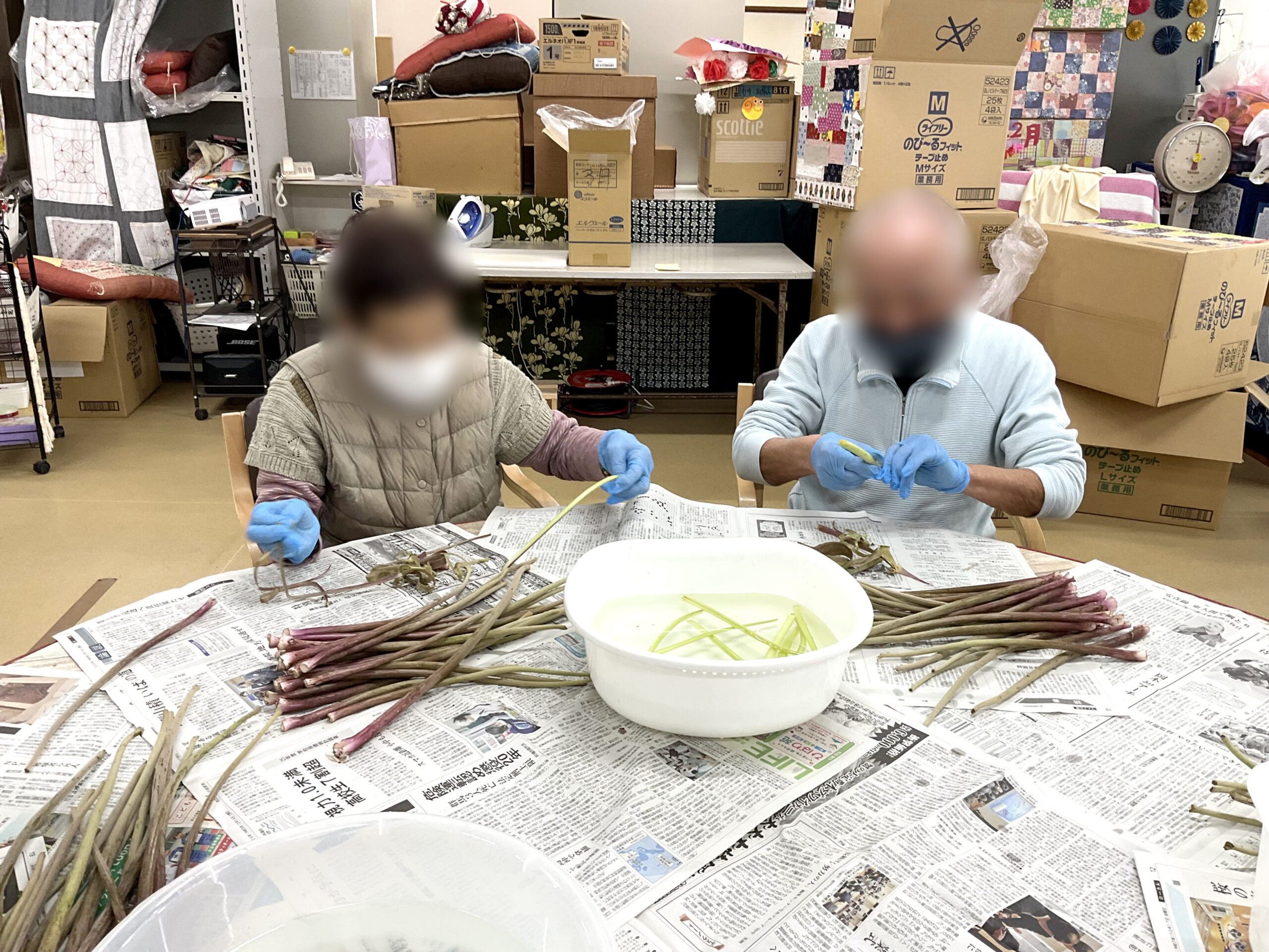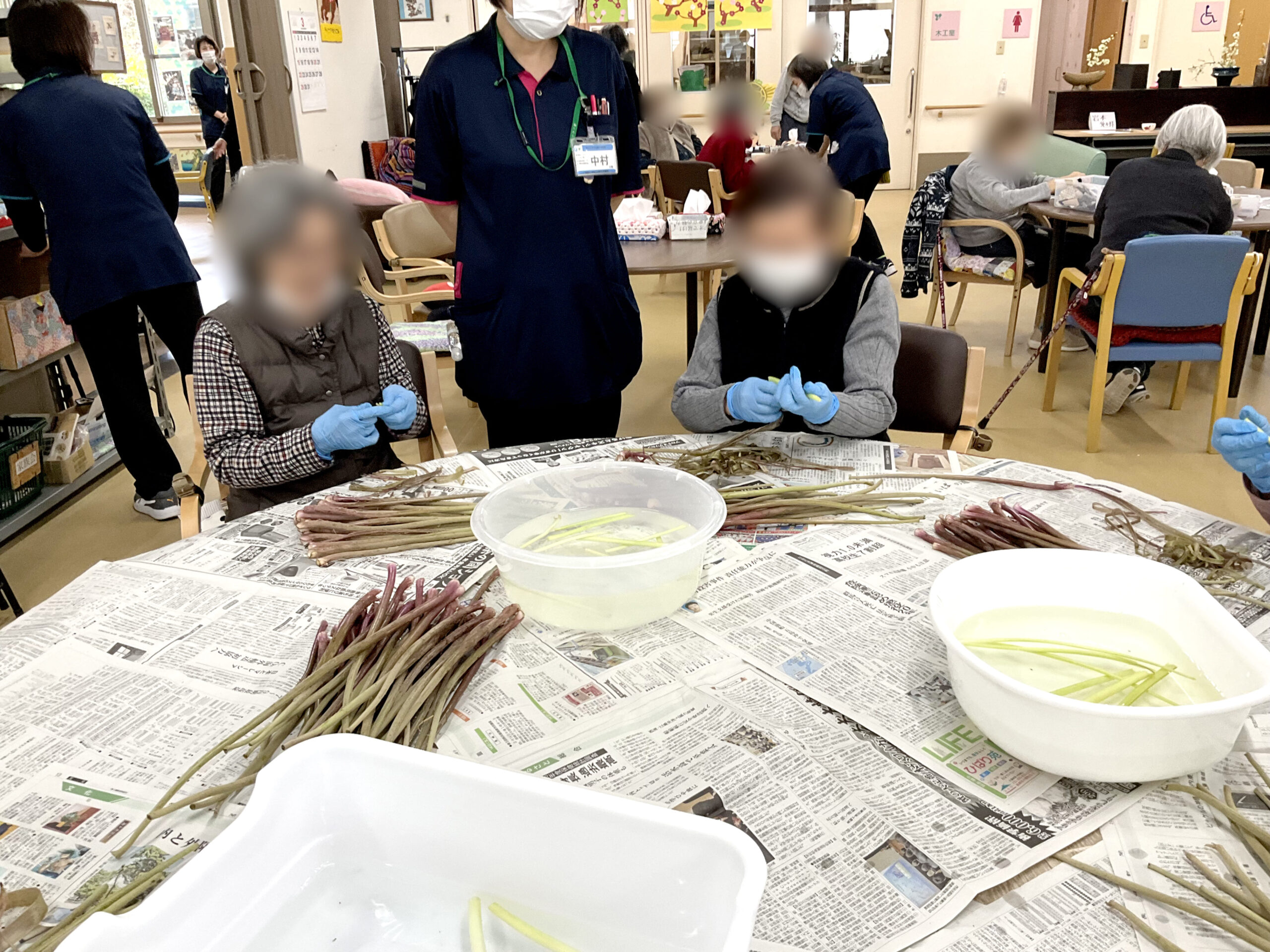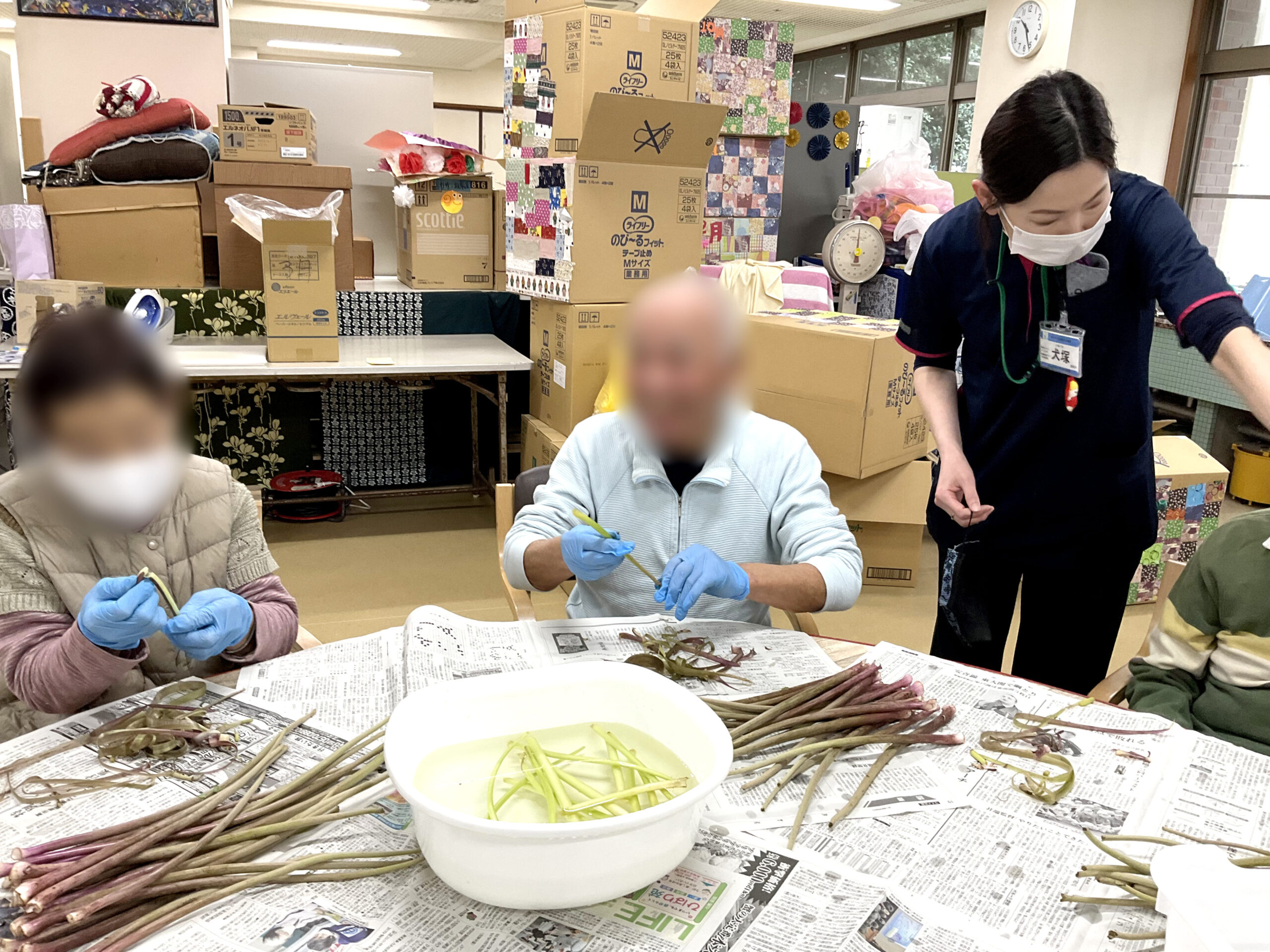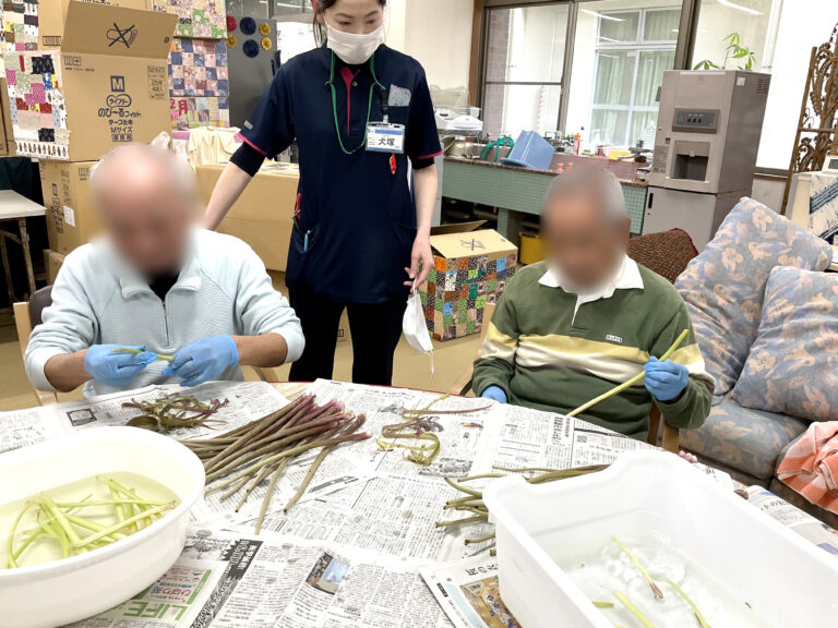 活動記録 デイケアゆうこう院内活動~つわ剥き~ 投稿日:2026年3月24日(火)2026年3月24日(火) 今年もつわの時期がやってきました。利用者の方々と皮むきをすると「昔はよく剥きよったねー」「親にさせられてた」と楽しく話をしながら手際よく取り組まれていました。皮むきをしたつわは蒲鉾と一緒に煮て、昼食時に少しずつ食べて頂きました。味付けも好評で懐かしんでおられる方が多くおられました。